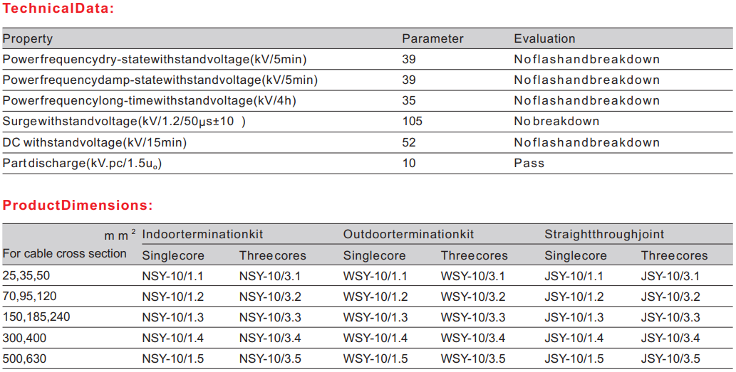 For 6/10kV and 8.7/15kV single core or 3 cores PVC and XLPE power cable termination kit and straight through joint, with good electrical and mechanical properties.