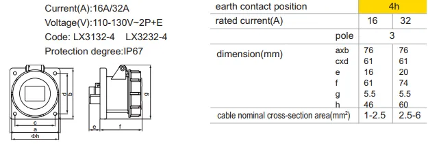 The LX3132-4 / LX3232-4 IP67 Panel Mounted Industrial Socket series is specifically designed for panel-mounted installation—whether in switchgear, equipment enclosures or outdoor-protected cabinets. The panel mounted industrial socket format ensures that the socket is securely fixed into a cut-out, providing a clean, reliable interface for industrial plugs. By selecting the LX3132-4 or LX3232-4 panel mounted industrial socket, you ensure a professional, integrated mounting solution rather than a loose or external connector.
