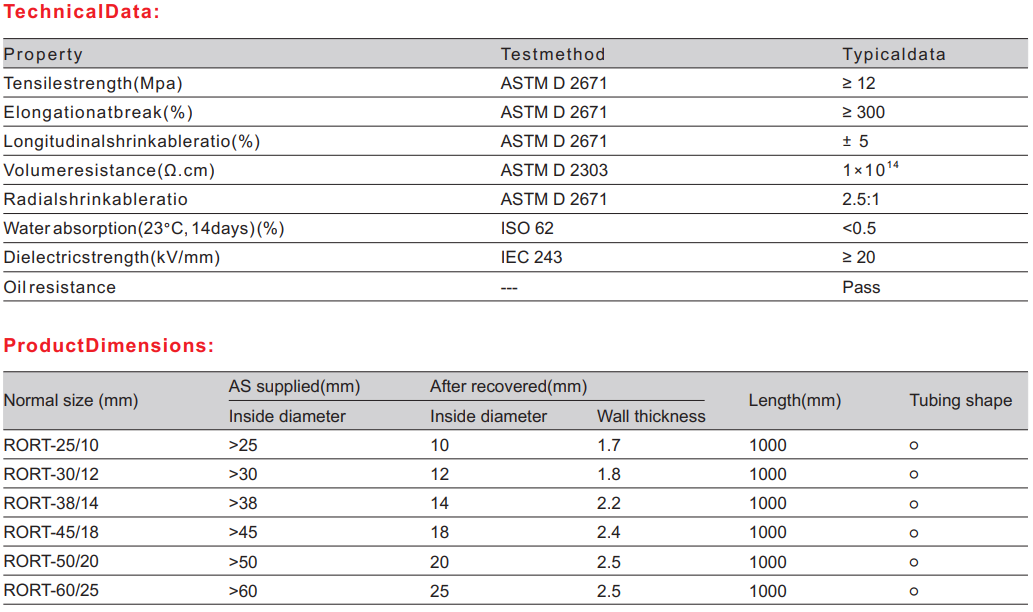 RORT is manufactured with radiation cross-linked oil resistant polyolefin, and suitable for application in PILC power cable termination kit and joint.
